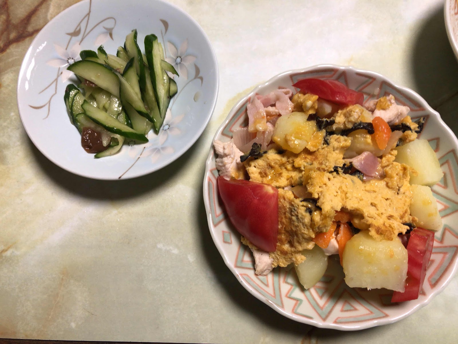 今日は 鳥胸肉のじゃがいも炒めを木耳を麺つゆで煮込んで卵とじして こさえてみました